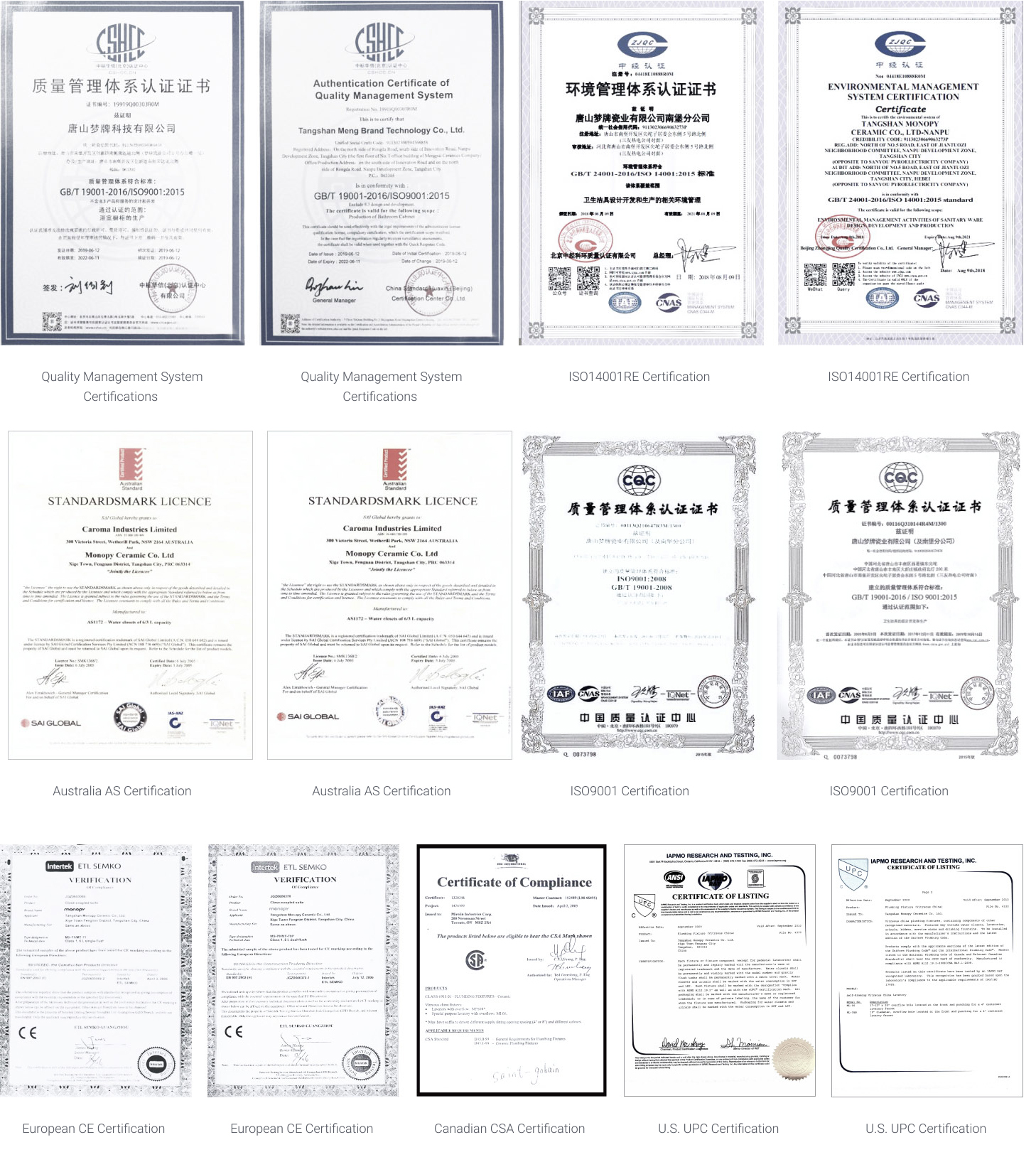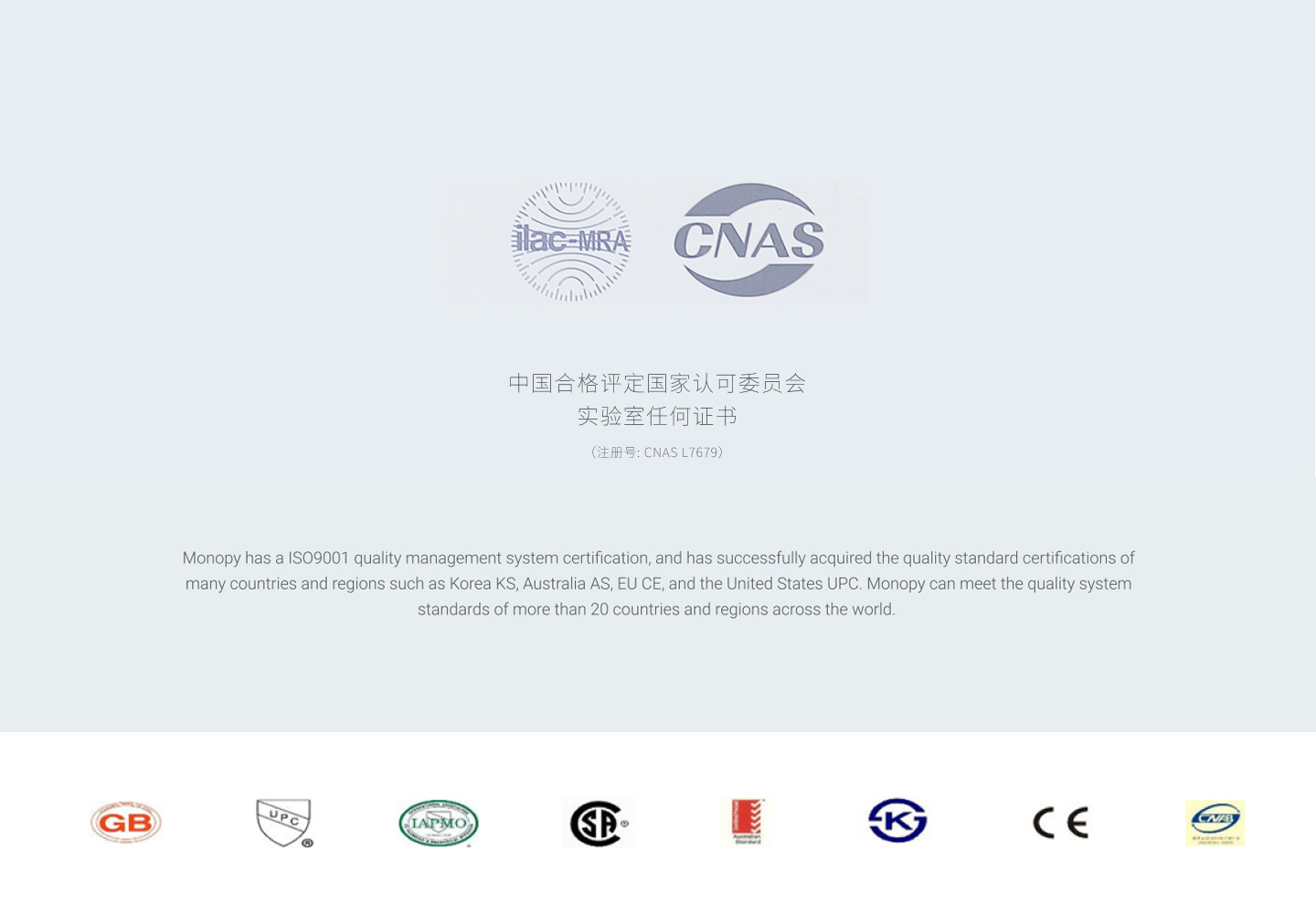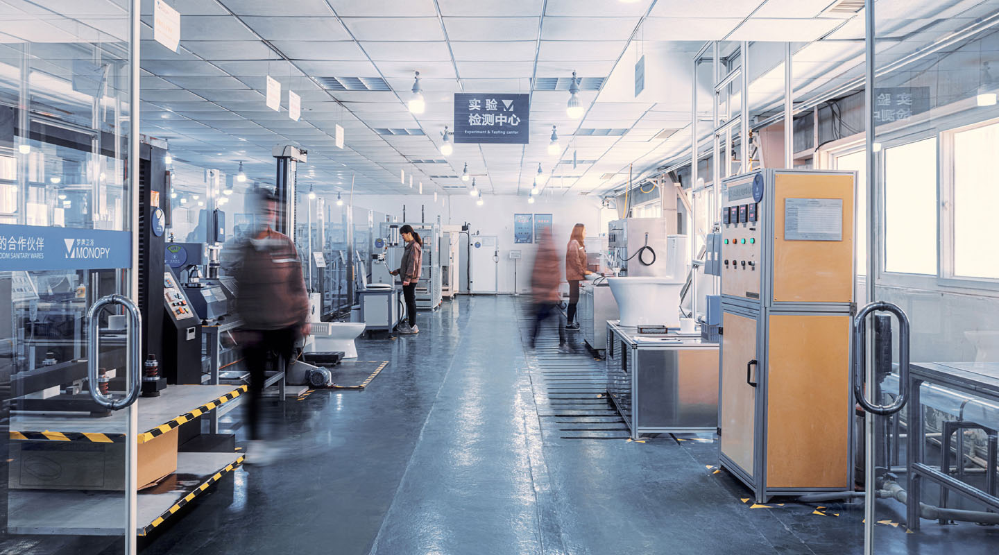 The testing laboratory in Monopy, is accredited by the Chinese National Accredited Service for Conformity Assessment (CNAS), which can achieve full-function testing of ceramic products, compression, burst resistance, edge pressure and drop testing of product packaging boxes, water fittings, seats and other related tests .